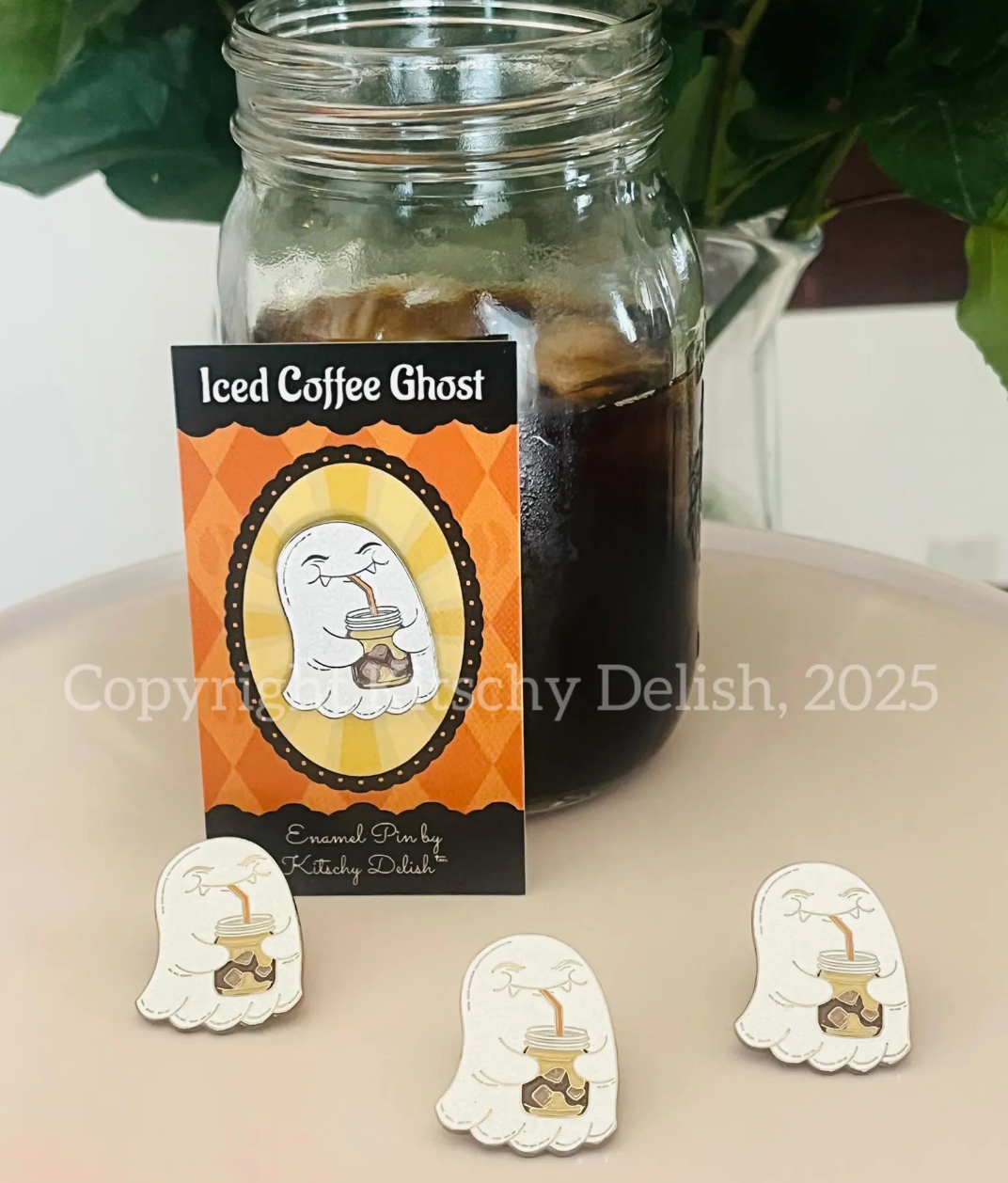 Beat the summer heat with spooky vibes! This adorable enamel pin features a friendly ghost sipping a refreshing iced coffee, perfect for those who love Halloween all year long.