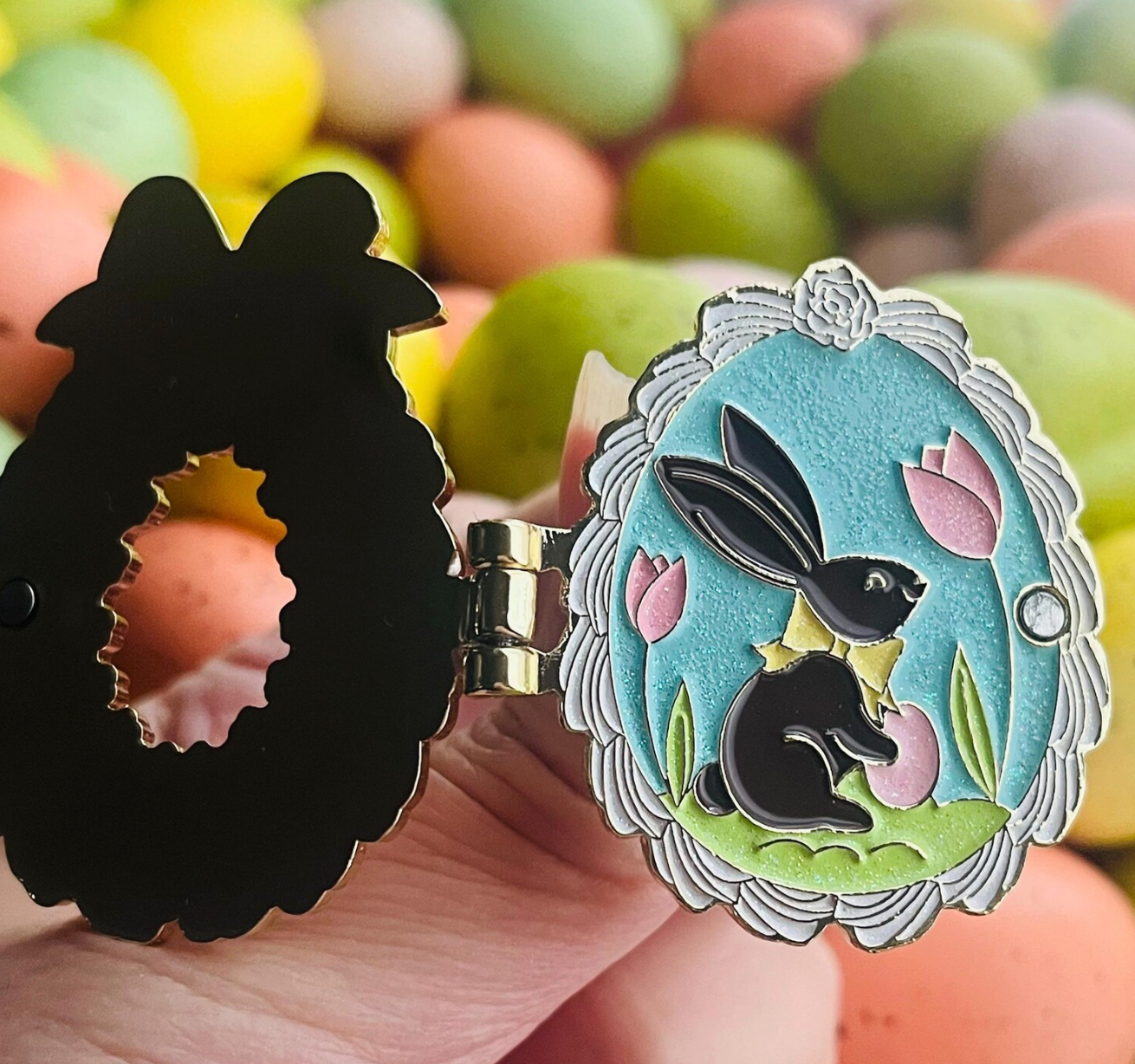 Just in time for Easter, this delightful Sugar Egg Diorama Pin is hopping into the shop! Inspired by the classic sugared eggs from the ‘80s, this nostalgic pin features a charming chocolate bunny nestled inside a glittery, candy-colored egg.
